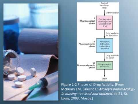 Figure 2-2 Phases of Drug Activity. (From McKenry LM, Salerno E: Mosby’s pharmacology in nursing—revised and updated, ed 21, St. Louis, 2003, Mosby.)
