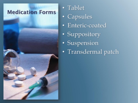 Medication Forms • Tablet • Capsules • Enteric-coated • Suppository • Suspension • Transdermal patch