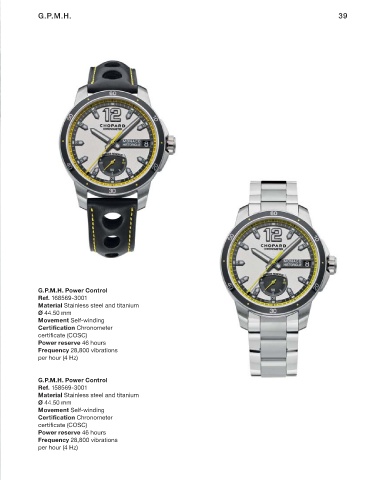 G.P.M.H. Power Control Material Stainless steel and titanium Movement Self-winding Certification Chronometer Power reserve 46 hours Frequency 28,800 vibrations G.P.M.H. Power Control Material Stainless steel and titanium Movement Self-winding Certification Chronometer Power reserve 46 hours Frequency 28,800 vibrations