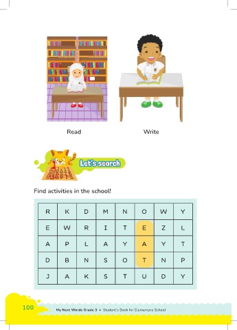 Read Write t’ t’ Le Le Le t’ s search s search s search Let’s search Find activities in the school! R K D M N O W Y E W R I T E Z L A P L A Y A Y T D B N S O T N P J A K S T U D Y 100 My Next Words Grade 3 • Student’s Book for Elementary School 101