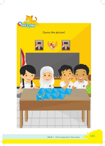 s play t’ s play s play t’ Let’s play Le Le Le t’ Guess the picture! 100 Unit 8 • I drink orange juice in the canteen 101