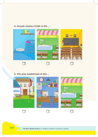 4. Aisyah studies Math in the … KANTIN BHINEKA ☐ ☐ ☐ 5. We play badminton in the … KANTIN BHINEKA ☐ ☐ ☐ 108 My Next Words Grade 3 • Student’s Book for Elementary School 109