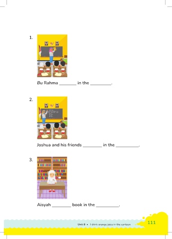 1. Bu Rahma _________ in the ___________. 2. Joshua and his friends __________ in the ____________. 3. Aisyah __________ book in the ____________. 110 Unit 8 • I drink orange juice in the canteen 111