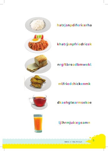 hatrjsnpdifericerha khatrjsnpfriedricek nrgftbreadbmwekl mlfriedchickenmk dkaehgtearmsekoe ljlhrmjuicegeamn 5 Unit 1 • I like Mi Aceh