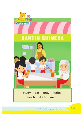 w w w w w ords ords w ords My new words My My My ne ne ne KANTIN BHINEKA study eat pray write teach drink read 112 Unit 8 • I drink orange juice in the canteen 113