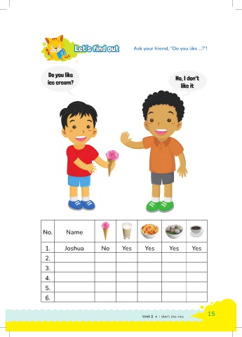 t’ s find t’ Le Le Le t’ out out out s find s find Let’s find out Ask your friend, “Do you like …?”! Do you like No, I don’t ice cream? like it No. Name 1. Joshua No Yes Yes Yes Yes 2. 3. 4. 5. 6. 15 Unit 2 • I don’t like rice
