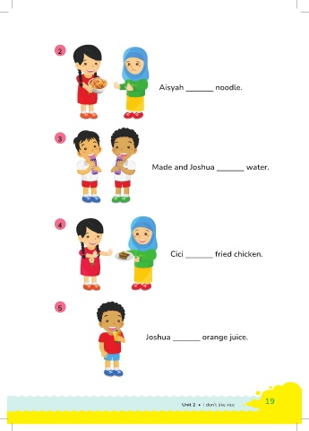 2 Aisyah ________ noodle. 3 Made and Joshua ________ water. 4 Cici ________ fried chicken. 5 Joshua ________ orange juice. 19 Unit 2 • I don’t like rice