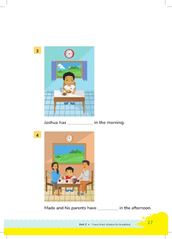 3 Joshua has ______________ in the morning. 4 Made and his parents have ____________ in the afternoon. 26 Unit 3 • I have fried chicken for breakfast 27