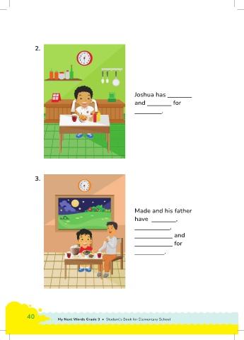2. Joshua has _________ and _________ for __________. 3. Made and his father have _________, _____________, ______________ and ______________ for ___________. 40 My Next Words Grade 3 • Student’s Book for Elementary School 41