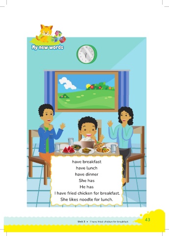 w w w ords ords w My new words My My My ne w w ords ne ne have breakfast have lunch have dinner She has He has I have fried chicken for breakfast. She likes noodle for lunch. 42 Unit 3 • I have fried chicken for breakfast 43