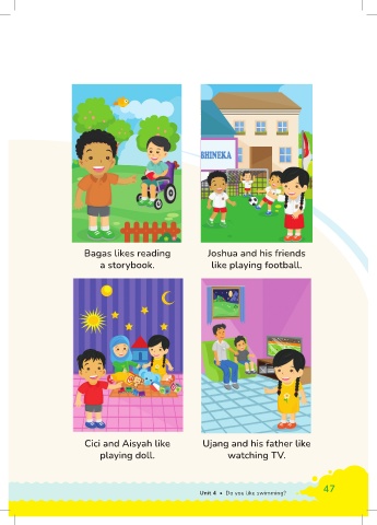 Bagas likes reading Joshua and his friends a storybook. like playing football. Cici and Aisyah like Ujang and his father like playing doll. watching TV. 46 Unit 4 • Do you like swimming? 47