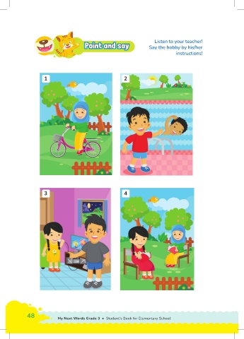 Listen to your teacher! Point and sayoint and say P oint and say P P oint and say Say the hobby by his/her instructions! 1 2 3 4 48 My Next Words Grade 3 • Student’s Book for Elementary School Unit 4 • Do you like swimming? 49
