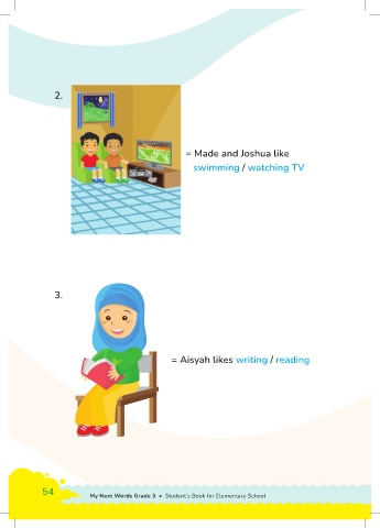2. = Made and Joshua like swimming / watching TV 3. = Aisyah likes writing / reading 54 My Next Words Grade 3 • Student’s Book for Elementary School Unit 4 • Do you like swimming? 55