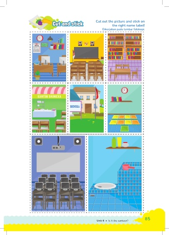 Cut and stick Cut and stick Cut and stick Cut and stick Cut out the picture and stick on the right name label! Dikerjakan pada lembar fotokopi. KANTIN BHINEKA 84 Unit 6 • Is it the canteen? 85