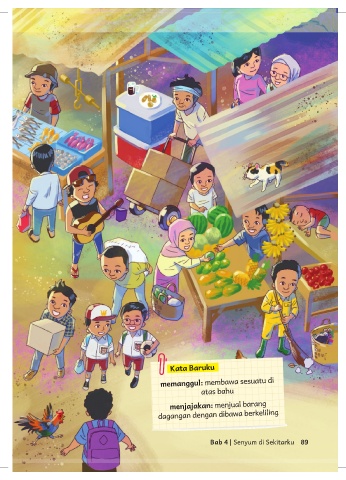 Kata Baruku memanggul: membawa sesuatu di atas bahu menjajakan: menjual barang dagangan dengan dibawa berkeliling Bab 4 | Senyum di Sekitarku 89