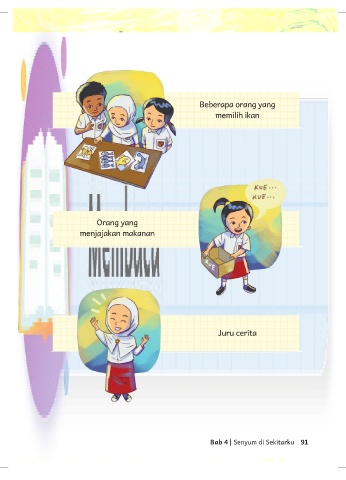 Beberapa orang yang memilih ikan Orang yang menjajakan makanan Juru cerita Bab 4 | Senyum di Sekitarku 91
