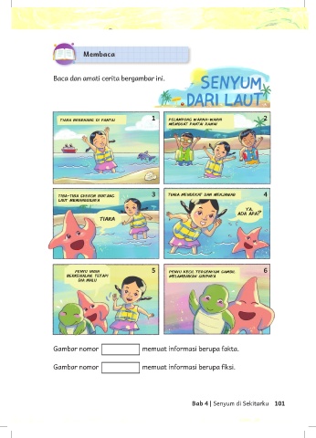 Baca dan amati cerita bergambar ini. 1 2 3 4 5 6 Gambar nomor memuat informasi berupa fakta. Gambar nomor memuat informasi berupa fiksi. Bab 4 | Senyum di Sekitarku 101