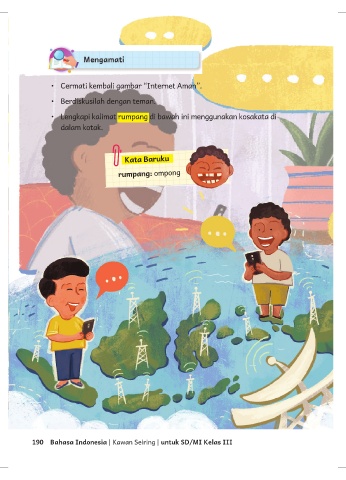 • Cermati kembali gambar “Internet Aman”. • Berdiskusilah dengan teman. • Lengkapi kalimat rumpang di bawah ini menggunakan kosakata di dalam kotak. Kata Baruku rumpang: ompong 190 Bahasa Indonesia | Kawan Seiring | untuk SD/MI Kelas III