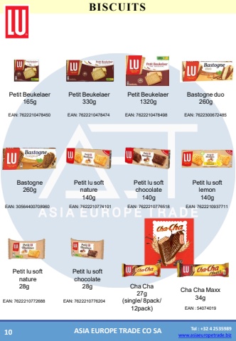 www.asiaeuropetrade.bizTel : +32 4 2535989www.asiaeuropetrade.bizASIA EUROPE TRADE CO SABISCUITSEAN:7622210478450EAN:7622210478474EAN:7622210478498EAN:7622210774101EAN:7622210776518EAN:7622210937711EAN:7622210772688EAN:7622210776204PetitBeukelaer165gPetitBeukelaer330gPetitBeukelaer1320gPetit lusoft nature 140gPetit lusoft chocolate 140gPetit lusoft lemon 140gPetit lusoft nature 28gPetit lusoft chocolate 28gEAN:7622300672485Bastogneduo 260gEAN:30564400708960Bastogne 260gChaCha27g(single/8pack/ 12pack)EAN :54074019Cha ChaMaxx34g10