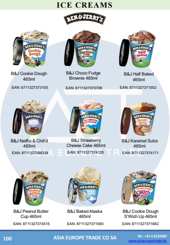www.asiaeuropetrade.bizTel : +32 4 2535989www.asiaeuropetrade.bizASIA EUROPE TRADE CO SAICECREAMSB&J Cookie Dough465mlEAN:8711327373105B&J Choco Fudge Brownie 465mlEAN:8711327370708B&J Half Baked465mlEAN:8711327371002B&J Netflix & Chill%u2019d465mlEAN:8711327386334B&J PeanutButter Cup 465mlEAN:8711327374515B&J Cookie Dough S%u2019WichUp 465mlEAN:8711327371682B&J StrawberryCheeseCake 465mlEAN:8711327374126B&J KaramelSutra465mlEAN:8711327374171B&J BakedAlaska 465mlEAN:8711327371590100
