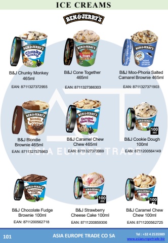 www.asiaeuropetrade.bizTel : +32 4 2535989www.asiaeuropetrade.bizASIA EUROPE TRADE CO SAICECREAMSB&J ChunkyMonkey465mlEAN:8711327372955B&J ConeTogether 465mlEAN:8711327386303B&J Moo-PhoriaSaltedCamarelBrownie 465mlEAN:8711327371903B&J Blondie Brownie 465mlEAN:8711327375963B&J StrawberryCheeseCake 100mlEAN:8711200859306B&J ChocolateFudge Brownie 100mlEAN:8711200562718B&J Cookie Dough 100mlEAN:8711200564149B&J Caramel ChewChew100mlEAN:8711200562725B&J Caramel ChewChew465mlEAN:8711327373969101
