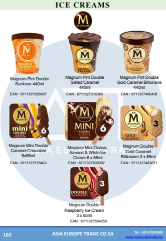 www.asiaeuropetrade.bizTel : +32 4 2535989www.asiaeuropetrade.bizASIA EUROPE TRADE CO SAICECREAMSMagnum PintDouble Sunlover440mlEAN : 8711327585607Magnum PintDouble Gold Caramel Billionaire440mlEAN : 8711327480438Magnum PintDouble SaltedCaramel 440mlEAN : 8711327315365Magnum Mini Double Caramel Chocolate6x55mlEAN : 8711327578463Magnum Mini Classic, Almond & White Ice Cream 6 x 55mlEAN : 8711327609082Magnum Double Gold Caramel Billionaire3 x 85mlEAN : 8711327483071Magnum Double Raspberry Ice Cream 3 x 85mlEAN : 8711327584259102