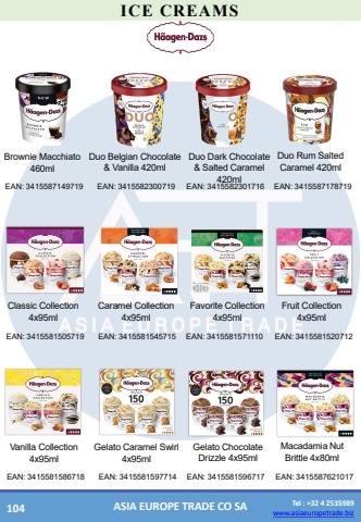www.asiaeuropetrade.bizTel : +32 4 2535989www.asiaeuropetrade.bizASIA EUROPE TRADE CO SAICECREAMSBrownie Macchiato460mlEAN:3415587149719Duo Belgian Chocolate& Vanilla420mlEAN:3415582300719Duo DarkChocolate& SaltedCaramel 420mlEAN:3415582301716Duo RumSaltedCaramel 420mlEAN:3415587178719ClassicCollection4x95mlEAN:3415581505719Caramel Collection4x95mlEAN:3415581545715Favorite Collection4x95mlEAN:3415581571110Fruit Collection4x95mlEAN:3415581520712VanillaCollection4x95mlEAN:3415581586718Gelato Caramel Swirl4x95mlEAN:3415581597714Gelato ChocolateDrizzle4x95mlEAN:3415581596717Macadamia NutBrittle4x80mlEAN:3415587621017104