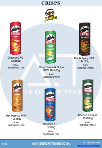 www.asiaeuropetrade.bizTel : +32 4 2535989www.asiaeuropetrade.bizASIA EUROPE TRADE CO SACRISPSOriginal ORG19x165g EAN: 5053990127726 Sour Cream & Onion SCO 19x165g EAN: 5053990127740 Hot & Spicy H&S19x165g EAN: 5053990127665 Hot Paprika HPR 19x165g EAN: 5053990161669Ketchup KET 9x165gEAN:5053990121922 Cheese& Onion19x165g EAN:5053990127641 108