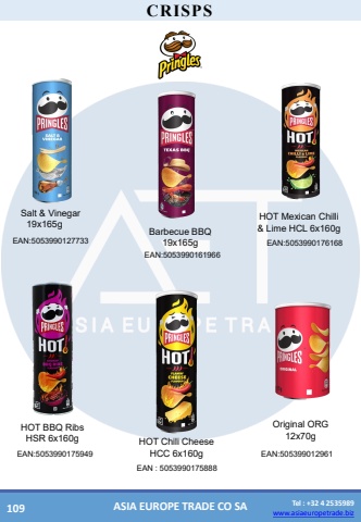 www.asiaeuropetrade.bizTel : +32 4 2535989www.asiaeuropetrade.bizASIA EUROPE TRADE CO SACRISPSSalt & Vinegar19x165g EAN:5053990127733 Barbecue BBQ 19x165g EAN:5053990161966 HOT BBQ RibsHSR 6x160gEAN:5053990175949EAN:5053990176168HOT MexicanChilli& Lime HCL 6x160gHOT Chili Cheese HCC 6x160gEAN : 5053990175888Original ORG12x70gEAN:505399012961109