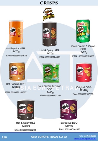 www.asiaeuropetrade.bizTel : +32 4 2535989www.asiaeuropetrade.bizASIA EUROPE TRADE CO SACRISPSSour Cream & Onion SCO12x70gEAN : 5053990125050Hot Paprika HPR12x70g EAN:5053990161638Hot & Spicy H&S12x70gEAN:5053990124886Original ORG12x40g EAN:5053990107339Sour Cream & Onion SCO12x40g EAN:5053990107384Hot Paprika HPR12x40gEAN: 5053990161607Hot & Spicy H&S12x40g EAN: 5053990107292Barbecue BBQ12x40g EAN: 5053990161935110