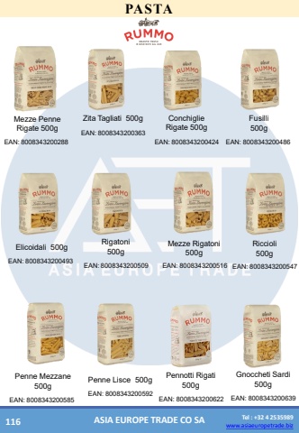 www.asiaeuropetrade.bizTel : +32 4 2535989www.asiaeuropetrade.bizASIA EUROPE TRADE CO SAPASTAFusilli500gEAN: 8008343200486Mezze Penne Rigate500gEAN:8008343200288Zita Tagliati500gEAN:8008343200363Conchiglie Rigate500gEAN:8008343200424Mezze Rigatoni 500gEAN: 8008343200516Riccioli500gEAN: 8008343200547Elicoidali500gEAN: 8008343200493Rigatoni500gEAN:8008343200509PennottiRigati500gEAN: 8008343200622GnocchetiSardi500gEAN: 8008343200639Penne Mezzane500gEAN: 8008343200585Penne Lisce500gEAN: 8008343200592116