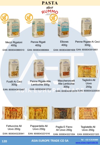 www.asiaeuropetrade.bizTel : +32 4 2535989www.asiaeuropetrade.bizASIA EUROPE TRADE CO SAPASTAPenne RigateAi Ceci 300gEAN: 8008343810661MezziRigatoni 400gEAN: 8008343880510Penne Rigati400gEAN: 8008343880664Elbows400gEAN: 8008343881609MaccheroncelliAlle Lenticchie300gEAN: 8008343812078TaglioliniAll Uovo250gEAN: 8008343220934Fusilli Ai Ceci 300gEAN: 8008343810487Penne RigateAlle Lenticchie300gEAN: 8008343812702PagliaE FienoAll Uovo250gEAN: 8008343221054Tagliatelle All Uovo250gEAN: 8008343221320FettuccineAll Uovo250gEAN: 8008343220941PappardelleAll Uovo250gEAN: 8008343221016120