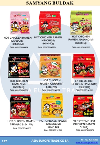 www.asiaeuropetrade.bizTel : +32 4 2535989www.asiaeuropetrade.bizASIA EUROPE TRADE CO SASAMYANGBULDAKHOT CHICKEN RAMEN CARBO(M)8x5x130gEAN: 8801073144484HOT CHICKEN RAMEN KIMCHI(M) 8x5x140gEAN: 8801073142961HOT CHICKEN RAMEN JJAJANG(M) 8x5x140gEAN: 8801073142367HOT CHICKEN RAMEN(M) 8x5x140gEAN: 8801073140578HOT CHICKEN RAMEN-CURRY(M) 8x5x140gEAN: 8801073141872EXTREME HOT CHICKEN RAMEN(M)8x5x140gEAN:8801073141896HOT CHICKEN RAMEN STEW(M) 8x5x145gEAN: 8801073141858HOT CHICKEN RAMEN CHEESE(M) 8x5x140gEAN: 88010731417803X EXTREME HOT CHICKEN RAMEN 5x140gEAN: 8801073142978127