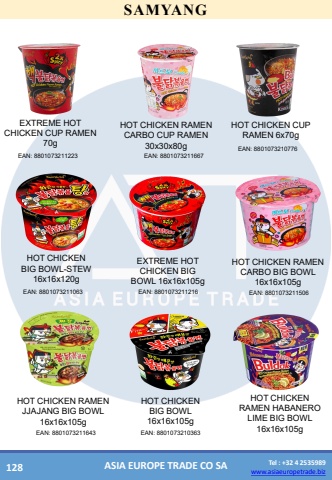 www.asiaeuropetrade.bizTel : +32 4 2535989www.asiaeuropetrade.bizASIA EUROPE TRADE CO SASAMYANGEXTREME HOT CHICKEN CUP RAMEN 70gEAN: 8801073211223HOT CHICKEN RAMEN CARBO CUP RAMEN 30x30x80g EAN: 8801073211667HOT CHICKEN BIG BOWL 16x16x105gEAN: 8801073210363HOT CHICKEN BIG BOWL-STEW 16x16x120g EAN: 8801073211063EXTREME HOT CHICKEN BIG BOWL 16x16x105g EAN: 8801073211216HOT CHICKEN RAMEN CARBO BIG BOWL 16x16x105gEAN: 8801073211506HOT CHICKEN RAMEN JJAJANG BIG BOWL 16x16x105gEAN: 8801073211643HOT CHICKEN CUP RAMEN 6x70gEAN: 8801073210776HOT CHICKEN RAMEN HABANERO LIME BIG BOWL 16x16x105g128