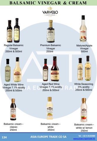 www.asiaeuropetrade.bizTel : +32 4 2535989www.asiaeuropetrade.bizASIA EUROPE TRADE CO SABALSAMICVINEGAR&CREAMRegularBalsamic Vinegar250ml &500mlPremiumBalsamic Vinegar 250mlMaturedApple Vinegar 500mlAged White Wine Vinegar 7.1%acidity 250ml &500mlAged Red Wine Vinegar 7.1%acidity 250ml &500mlWhiteSeasoning 5%acidity250ml &500mlBalsamic cream%u2013classic 250mlBalsamic cream%u2013white w/ lemon 250mlBalsamic cream%u2013white 250ml134