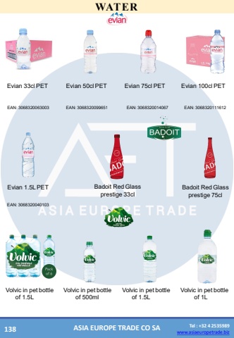 www.asiaeuropetrade.bizTel : +32 4 2535989www.asiaeuropetrade.bizASIA EUROPE TRADE CO SAWATEREvian 33clPETEAN:3068320063003Evian 50clPETEAN:3068320099651Evian 75clPETEAN:3068320014067Evian 100clPETEAN:3068320111612Evian 1.5LPETEAN:3068320040103Volvicin petbottle of 500mlVolvicin petbottle of 1.5LVolvicin petbottle of 1LVolvicin petbottle of 1.5LBadoit RedGlass prestige33clBadoit RedGlass prestige75cl138