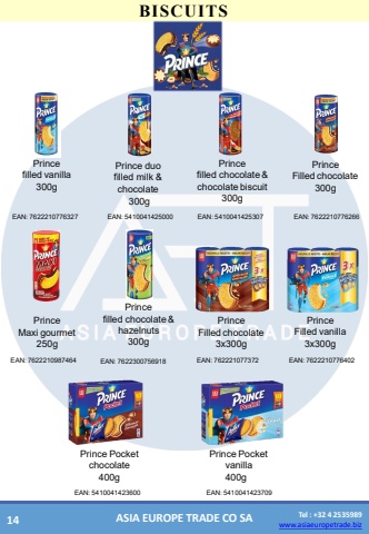 Tel : +32 4 2535989www.asiaeuropetrade.bizASIA EUROPE TRADE CO SABISCUITSEAN:7622210776327EAN:5410041425000EAN:5410041425307EAN:7622210987464EAN:7622300756918EAN:762221077372EAN:7622210776402EAN:5410041423600EAN:5410041423709Prince filledvanilla 300gPrinceduofilled milk&chocolate 300gPrincefilled chocolate& chocolatebiscuit 300gPrincefilled chocolate& hazelnuts300gPrince Maxigourmet250gPrince Filledchocolate3x300gPrince Filledvanilla 3x300gPrincePocket chocolate 400gPrincePocket vanilla 400gEAN:7622210776266Prince Filledchocolate300g14