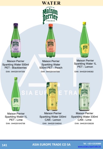 www.asiaeuropetrade.bizTel : +32 4 2535989www.asiaeuropetrade.bizASIA EUROPE TRADE CO SAWATERMaison Perrier Sparkling Water 500ml PET -BlackberriesEAN : 8445291047259Maison Perrier Sparkling Water 500ml PET -PeachEAN : 8445291047099Maison Perrier Sparkling Water 1L PET -LemonEAN : 8445291046382Maison Perrier Sparkling Water 1L PET -LimeEAN : 8445291045798Maison Perrier Sparkling Water 330ml CAN -LemonEAN : 8445291046542Maison Perrier Sparkling Water 330ml CAN -LimeEAN : 8445291038226141