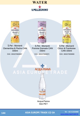 www.asiaeuropetrade.bizTel : +32 4 2535989www.asiaeuropetrade.bizASIA EUROPE TRADE CO SAWATERAcquaPanna50clPETS.Pel -Momenti Clementine & Peche CAN 330mlEAN : 8002270666667S.Pel -Momenti Pomme Grenade CAN 330mlEAN : 8002270686672S.Pel -Momenti Citron & Framboise CAN 330mlEAN : 8002270656668144