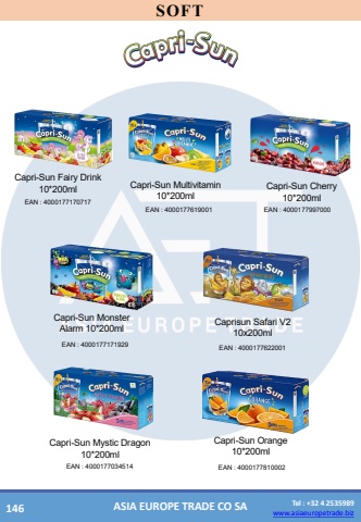 www.asiaeuropetrade.bizTel : +32 4 2535989www.asiaeuropetrade.bizASIA EUROPE TRADE CO SASOFTCapri-Sun Multivitamin 10*200mlEAN : 4000177619001Capri-Sun Cherry 10*200mlEAN : 4000177997000Capri-Sun FairyDrink 10*200mlEAN : 4000177170717Capri-Sun Orange 10*200ml EAN : 4000177810002Capri-Sun Monster Alarm10*200mlEAN : 4000177171929CaprisunSafari V210x200mlEAN : 4000177622001Capri-Sun Mystic Dragon 10*200ml EAN : 4000177034514146