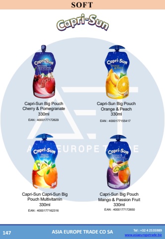 www.asiaeuropetrade.bizTel : +32 4 2535989www.asiaeuropetrade.bizASIA EUROPE TRADE CO SASOFTCapri-Sun Big PouchCherry & Pomegranate330mlEAN : 4000177172629Capri-Sun Big Pouch Orange & Peach 330mlEAN : 4000177155417Capri-Sun Big PouchMango & Passion Fruit 330mlEAN : 4000177172650Capri-Sun Capri-SunBig PouchMultivitamin330mlEAN : 4000177162316147
