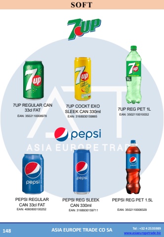 www.asiaeuropetrade.bizTel : +32 4 2535989www.asiaeuropetrade.bizASIA EUROPE TRADE CO SASOFT7UP REGULAR CAN 33cl FATEAN: 35021100089787UP COCKT EXO SLEEK CAN 330ml EAN: 31689301598657UP REG PET 1L EAN: 3502110010032PEPSI REG PET 1.5LEAN: 3502110008329PEPSI REGULAR CAN 33cl FAT EAN: 4060800100252PEPSI REG SLEEK CAN 330mlEAN: 3168930159711148