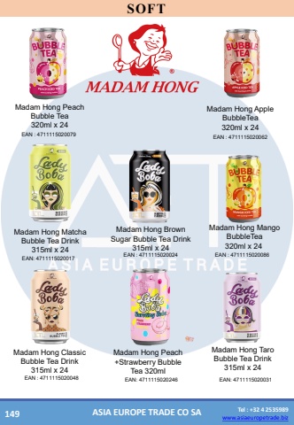 www.asiaeuropetrade.bizTel : +32 4 2535989www.asiaeuropetrade.bizASIA EUROPE TRADE CO SASOFTMadam Hong Peach Bubble Tea 320ml x 24EAN : 4711115020062MadamHong Mango BubbleTea320ml x 24MadamHong Apple BubbleTea320ml x 24 Madam Hong Classic Bubble Tea Drink 315ml x 24Madam Hong Brown Sugar Bubble Tea Drink 315ml x 24Madam Hong Taro Bubble Tea Drink315ml x 24EAN: 4711115020031MadamHong Matcha Bubble Tea Drink315ml x 24Madam Hong Peach +Strawberry Bubble Tea 320mlEAN : 4711115020048EAN: 4711115020246EAN : 4711115020024EAN: 4711115020017EAN : 4711115020086EAN : 4711115020079149