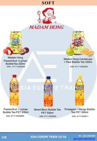 www.asiaeuropetrade.bizTel : +32 4 2535989www.asiaeuropetrade.bizASIA EUROPE TRADE CO SASOFTPassionfruit+ Lychee Bubble Tea PET 500ml EAN: 471115020604Mixed Berry Bubble Tea PET 500mlEAN: 471115020628Pineapple + Mango Bubble Tea PET 500mlEAN: 471115020611Madam Hong Passionfruit +Lychee BubbleTea320mlEAN : 4711115020239Madam Hong Cantaloupe + Pear Bubble Tea 320mlEAN: 4711115020253150