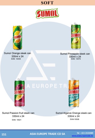 www.asiaeuropetrade.bizTel : +32 4 2535989www.asiaeuropetrade.bizASIA EUROPE TRADE CO SASOFTSumolOrange sleekcan330ml x 24 EAN: 10439SumolPineapplesleekcan 330ml x 24EAN: 10479 SumolPassion fruit sleek can330ml x 24EAN: 10521SumolAlgarve Orange sleek can330ml x 24 EAN:10508 151