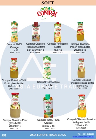 www.asiaeuropetrade.bizTel : +32 4 2535989www.asiaeuropetrade.bizASIA EUROPE TRADE CO SASOFTCompalCl%u00e1ssicoPassion fruit tetra pak330ml x 18EAN: 13158 Compal Cl%u00e1ssicoPeach glass bottle 200ml x 15EAN: 13563Compal Cl%u00e1ssico Tutti Frutti glass bottle 200ml x 15EAN: 13389Compal Cl%u00e1ssicoPineapple glass bottle200ml x 15EAN: 13377Compal Cl%u00e1ssicoPear glass bottle 200ml x 15 EAN: 13382Compal Cl%u00e1ssicoPassion fruit glass bottle200ml x 15EAN: 13381 Compal100% Orange 1L x 12EAN: 13413Compal100% Apple 1L x 12EAN: 13416Compal100% FrutaOrange 330ml x 18EAN: 13482CompalPineapplenectar1L x 12EAN: 14242153