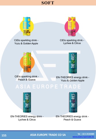www.asiaeuropetrade.bizTel : +32 4 2535989www.asiaeuropetrade.bizASIA EUROPE TRADE CO SASOFT155CiElosparklingdrink -Lychee & CitrusCiElosparklingdrink -Yuzu & Golden AppleCiElosparklingdrink -Peach& GuavaEN-THEORIES energydrink -Yuzu & Golden AppleEN-THEORIES energy drink -Lychee & CitrusEN-THEORIES energydrink -Peach& Guava