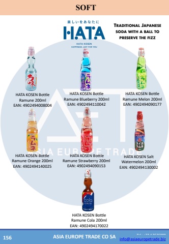www.asiaeuropetrade.bizTel : +32 4 2535989www.asiaeuropetrade.bizASIA EUROPE TRADE CO SAASIA EUROPE TRADE CO. S.A.info@asiaeuropetrade.bizHATA KOSEN Bottle Ramune200ml EAN: 4902494008004HATA KOSEN Bottle RamuneBlueberry 200mlEAN: 4902494110042HATA KOSEN Bottle Ramune Melon 200mlEAN: 4902494090177HATA KOSEN BottleRamuneOrange 200mlEAN: 4902494140025 HATA KOSEN BottleRamuneStrawberry200ml EAN: 4902494090153HATA KOSEN Salt Watermelon 200ml EAN: 4902494130002HATA KOSEN Bottle Ramune Cola 200mlEAN: 4902494170022TRADITIONALJAPANESESODAWITHABALLTOPRESERVETHEFIZZSOFT156