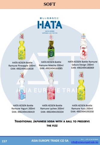 www.asiaeuropetrade.bizTel : +32 4 2535989www.asiaeuropetrade.bizASIA EUROPE TRADE CO SAASIA EUROPE TRADE CO. S.A.info@asiaeuropetrade.bizHATA KOSEN Bottle Ramune Sakura Design 200mlEAN: 4902494180069 HATA KOSEN Bottle Ramune Yogurt 200ml EAN: 4902494190419HATA KOSEN Bottle Ramune Lychee 200mlEAN: 4902494190334HATA KOSEN Bottle Ramune Yuzu 200ml EAN: 4902494190358TRADITIONALJAPANESESODAWITHABALLTOPRESERVETHEFIZZHATA KOSEN Bottle Ramune Matcha 200ml EAN: 4902494160085HATA KOSEN Bottle Ramune Pineapple 200mlEAN: 4902494110028SOFT157