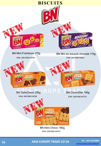 www.asiaeuropetrade.bizTel : +32 4 2535989www.asiaeuropetrade.bizASIA EUROPE TRADE CO SABISCUITSBN Mini Framboos175gEAN: 3061990143754 BN Mini bnbouuuhchocolat 175gEAN: 3061990144201 BN TartoChoco200gEAN: 3061990143785 BN ChocoStar195gEAN: 3061990143778 BN Hero Choco180gEAN: 3061990144072 16